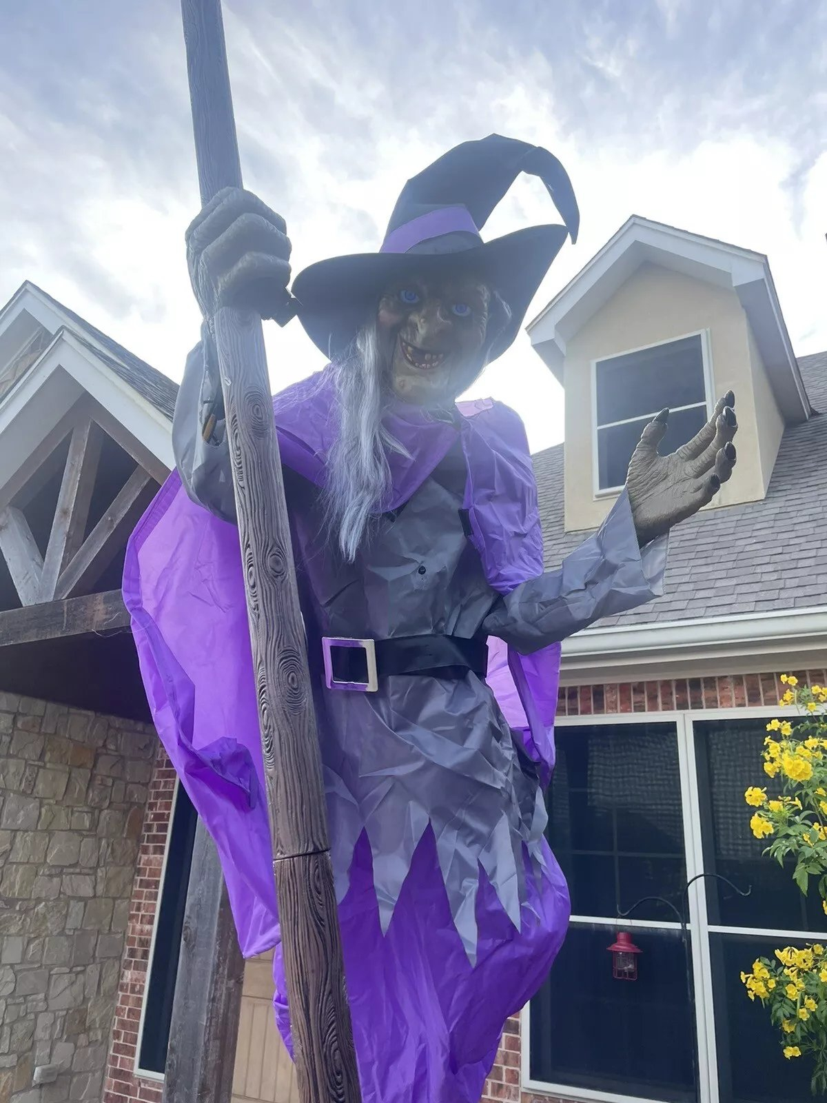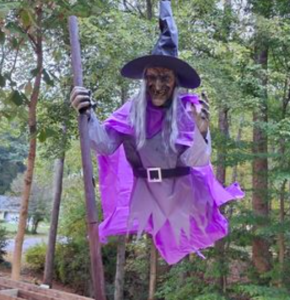 Designed for outdoor use, this foot flying witch animatronic is the perfect centerpiece for any Halloween party.